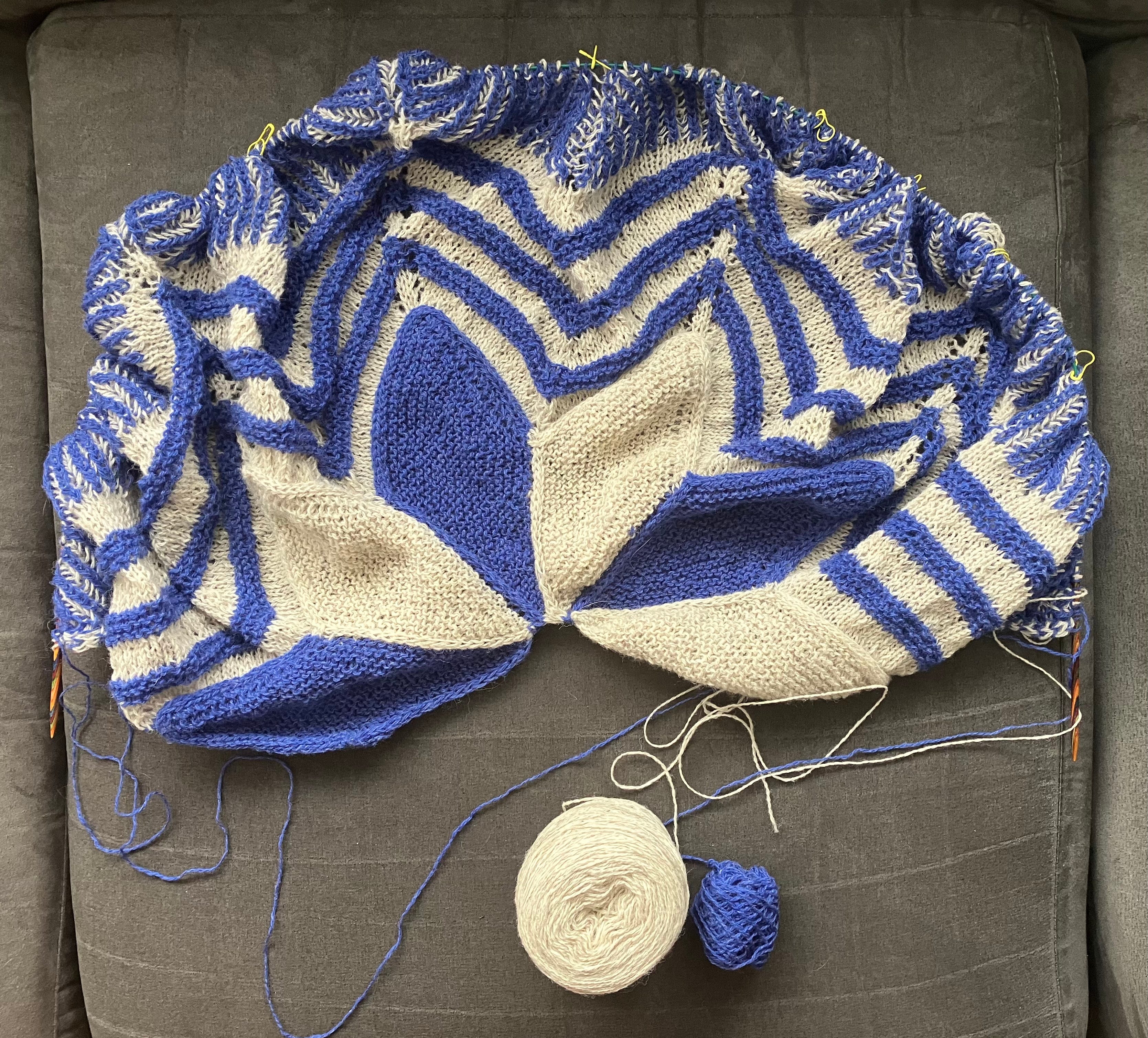 For any interested knitters, this is Stephen West’s Starflake shawl pattern, a WIP